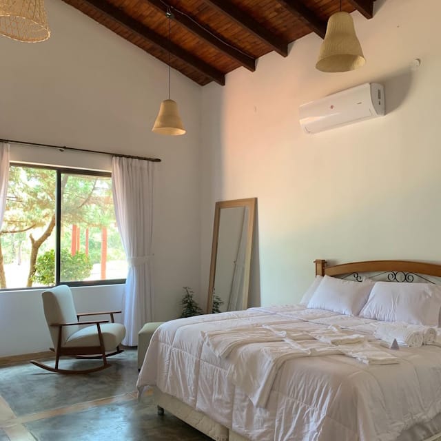 Entre sus amenities destacan habitaciones cómodas, áreas verdes, piscina, espacios de descanso y conexión directa con la naturaleza. Los niños de 3 a 10 años abonan el 50% de la tarifa por noche, y existe la opción de horario extendido por Gs. 50.000 por persona.